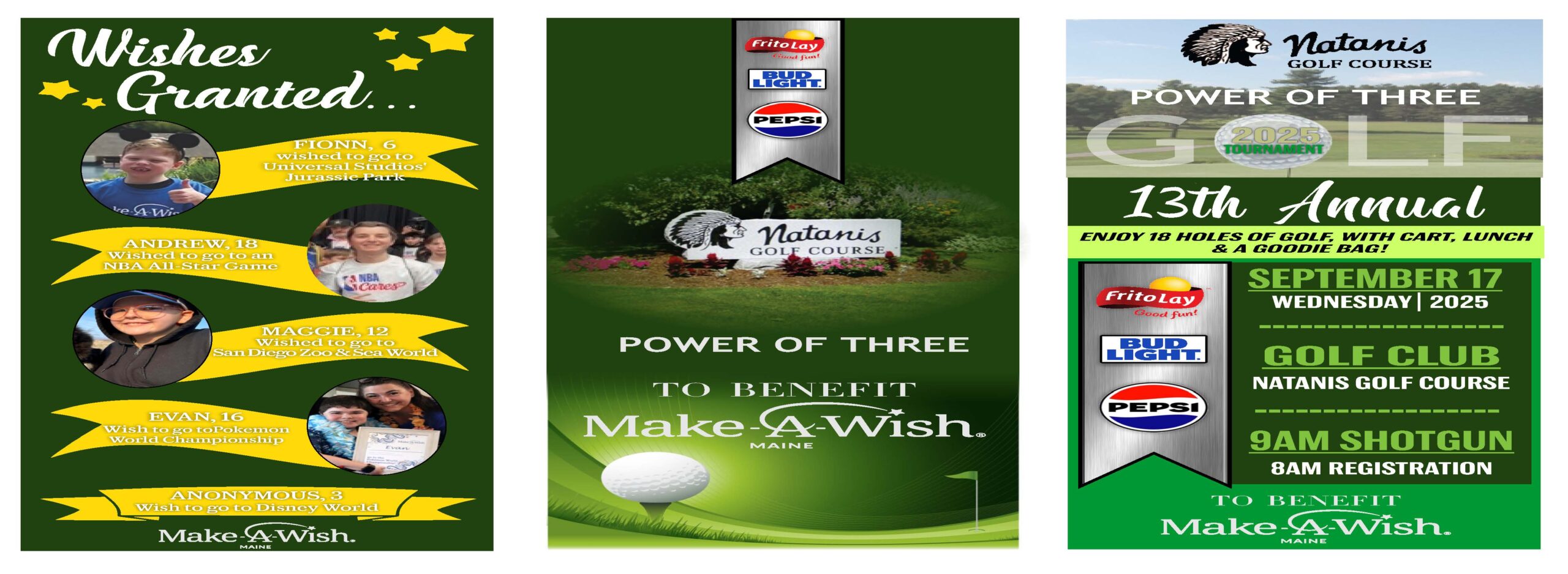Bud Light, Pepsi and Frito Lay cordially invite you the the 13th annual Power of Three golf tournament at Natanis Golf Course. For the past 12 years this powerhouse of a trio have raised over $333,000 in donations to the Make a Wish Maine foundation. In turn, they have been able to grant 45 wishes to children here in the great state of Maine!